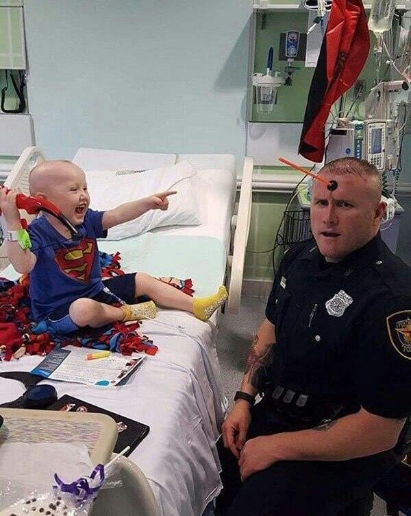 In this unforgettable moment, a young boy fighting illness sits in his hospital bed, dressed as Superman, with a radiant smile that could light up the darkest room. Next to him is a police officer, willingly playing along, with a toy dart stuck to his forehead and a perfectly serious face for the little hero’s amusement. The boy points and laughs with pure joy, his illness momentarily forgotten, his spirit lifted by the gift of laughter. 🌈✨
