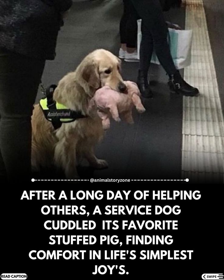 Day after day, service dogs dedicate their lives to helping humansโguiding, comforting, protecting, and being a steady source of strength in moments of weakness. Yet, even the strongest need comfort too. This touching photo shows a golden retriever service dog, after a long day of work, quietly holding onto its favorite stuffed pig. In that simple act, we are reminded that love and comfort are universal needs, shared across all beings. ๐๐ท