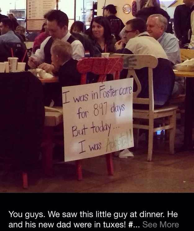 This touching photo captures a life-changing moment that speaks louder than words. At a dinner table filled with laughter and joy, a young boy sits proudly next to his new dad, both dressed in tuxedos for the occasion. But it’s the handwritten sign that tells the story in the most powerful way: “I was in foster care for 897 days. But today… I was adopted!!” 🌟👦