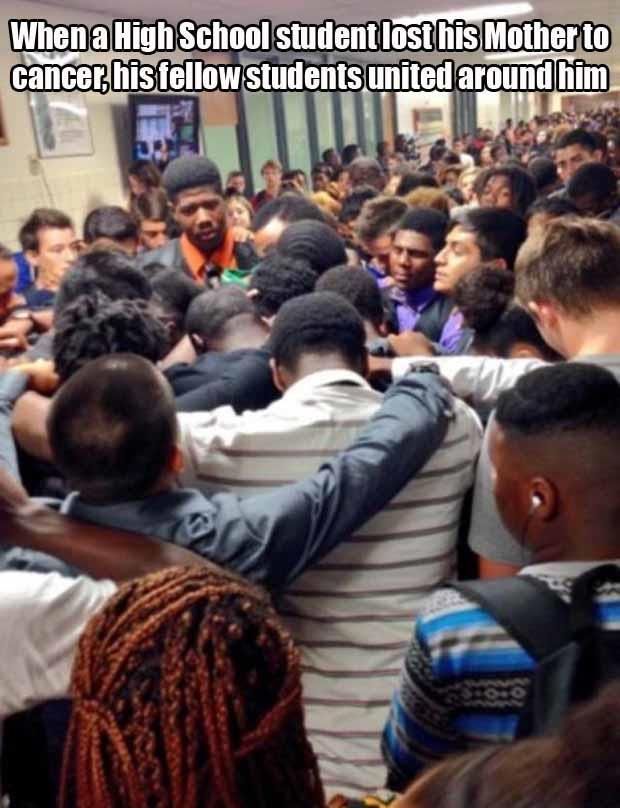 High school is often remembered for exams, friendships, and growing pains, but sometimes, it becomes the setting for extraordinary lessons in humanity. This powerful photograph captures such a moment. A student, grieving the devastating loss of his mother to cancer, stood in the hallway surrounded by the weight of unimaginable pain. But he was not alone. His classmates, teachers, and peers encircled him—arms interlocked, heads bowed—offering love, strength, and solidarity. 🌟🕊️