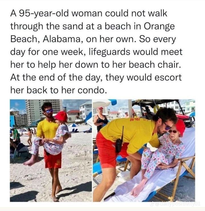 The images say it all: the lifeguard, strong and steady, carrying the elderly woman with tenderness; her smile and comfort reflecting the joy of being included, valued, and cared for. It’s a powerful reminder that kindness doesn’t require grand gestures—it thrives in small, consistent acts of humanity. 🌍✨