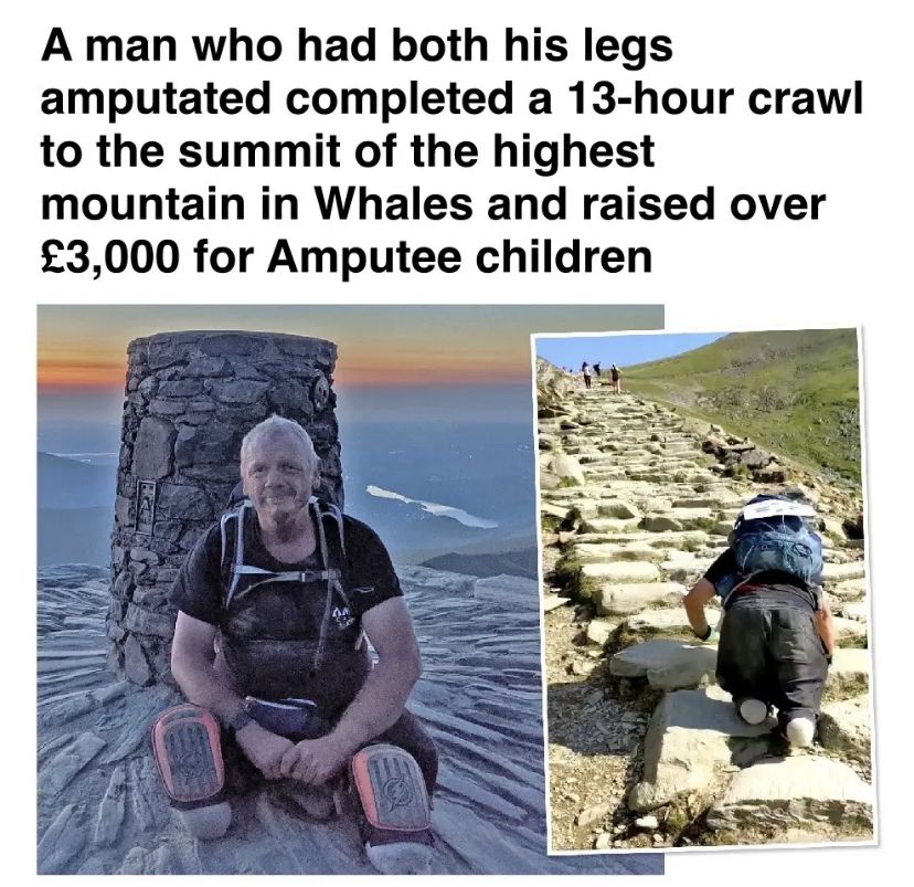 This extraordinary story is proof that the human spirit knows no limits. A man who had both his legs amputated took on one of the most grueling challenges imaginable—crawling to the summit of the highest mountain in Wales. For 13 hours, he pulled himself up rocky paths and steep trails, wearing protective gear on his knees and sheer determination in his heart. His mission was bigger than the mountain: he was raising funds for amputee children. 🌟🕊️