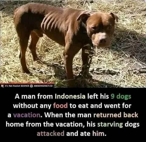 This heartbreaking image captures the devastating reality of what happens when loyalty and trust are betrayed by human neglect. The photograph shows a starving, emaciated dog chained and left without food, its ribs sharply visible, its eyes carrying both suffering and silent desperation. According to the story, a man in Indonesia left his 9 dogs behind with no food or care while he went on vacation. Days turned into weeks, and the once-faithful companions were left with nothing but hunger and despair. When he finally returned home, his starving dogs, driven by sheer survival instincts, attacked himโa tragic reminder that even the most loyal animals can be pushed to the edge when their basic needs are denied. ๐