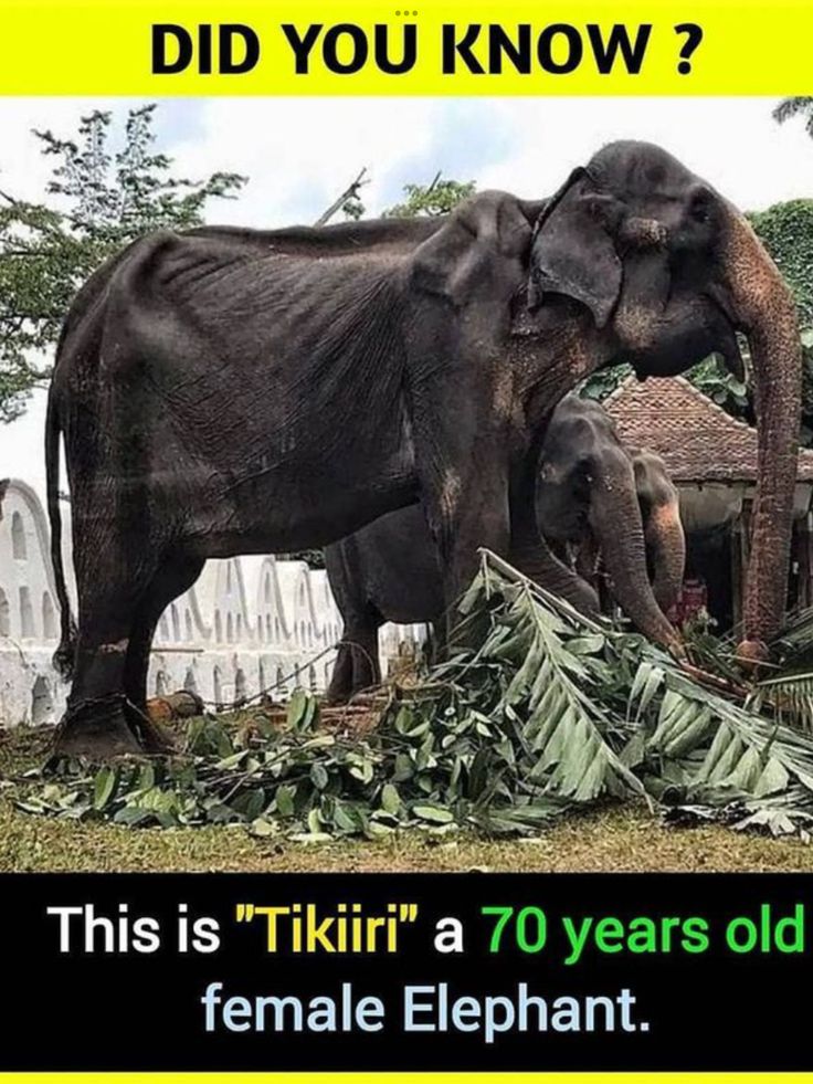 This powerful photograph captures Tikiiri, a 70-year-old female elephant whose frail and emaciated body tells a story of silent suffering and neglect. Her ribs are visible, her skin hangs loosely, and her once-majestic frame is reduced to weakness from years of hardship. Despite her condition, Tikiiri was forced to march in festivals and religious parades, dressed in colorful garments to hide the truth of her suffering body. Behind the veil of celebration, she carried the heavy burden of exploitation—a heartbreaking reality for one of the most intelligent and gentle creatures on earth. 🌑🌿