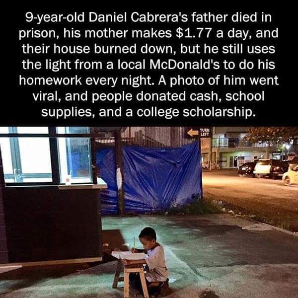 This unforgettable photograph captures the determination of 9-year-old Daniel Cabrera, a boy whose story touched millions around the world. Life had dealt him unimaginable hardships—his father passed away in prison, his family’s house was destroyed in a fire, and his mother struggled to survive on just $1.77 a day. With no electricity at home, Daniel refused to let poverty extinguish his hope for a brighter future. Every night, he carried a small chair and sat under the glow of a McDonald’s streetlight, using it to finish his homework. 🌙💡