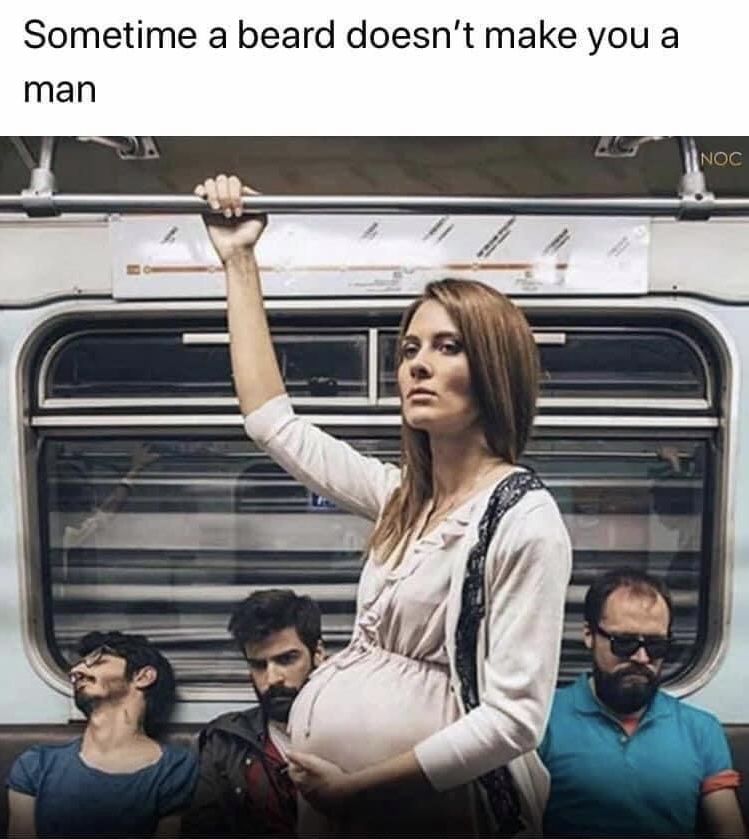 This striking image delivers a lesson that words alone could never capture. A pregnant woman stands on a crowded subway, holding onto the rail for balance, while three men—each with a beard, often seen as a symbol of masculinity—remain seated, ignoring her need for comfort. The caption says it best: “Sometimes a beard doesn’t make you a man.”