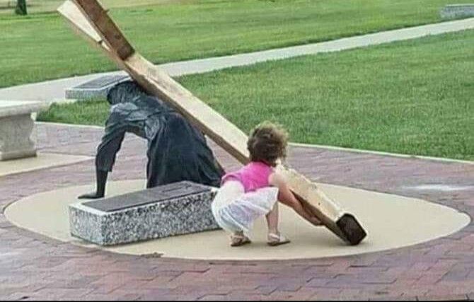 This powerful image captures something beyond ordinary—a little child, barely old enough to understand the world, instinctively bending down to help lift a heavy wooden cross from a statue depicting a struggling figure. Though the cross is much too large for her tiny hands, the gesture speaks volumes: compassion, love, and the innate desire to ease another’s burden. 💕👶