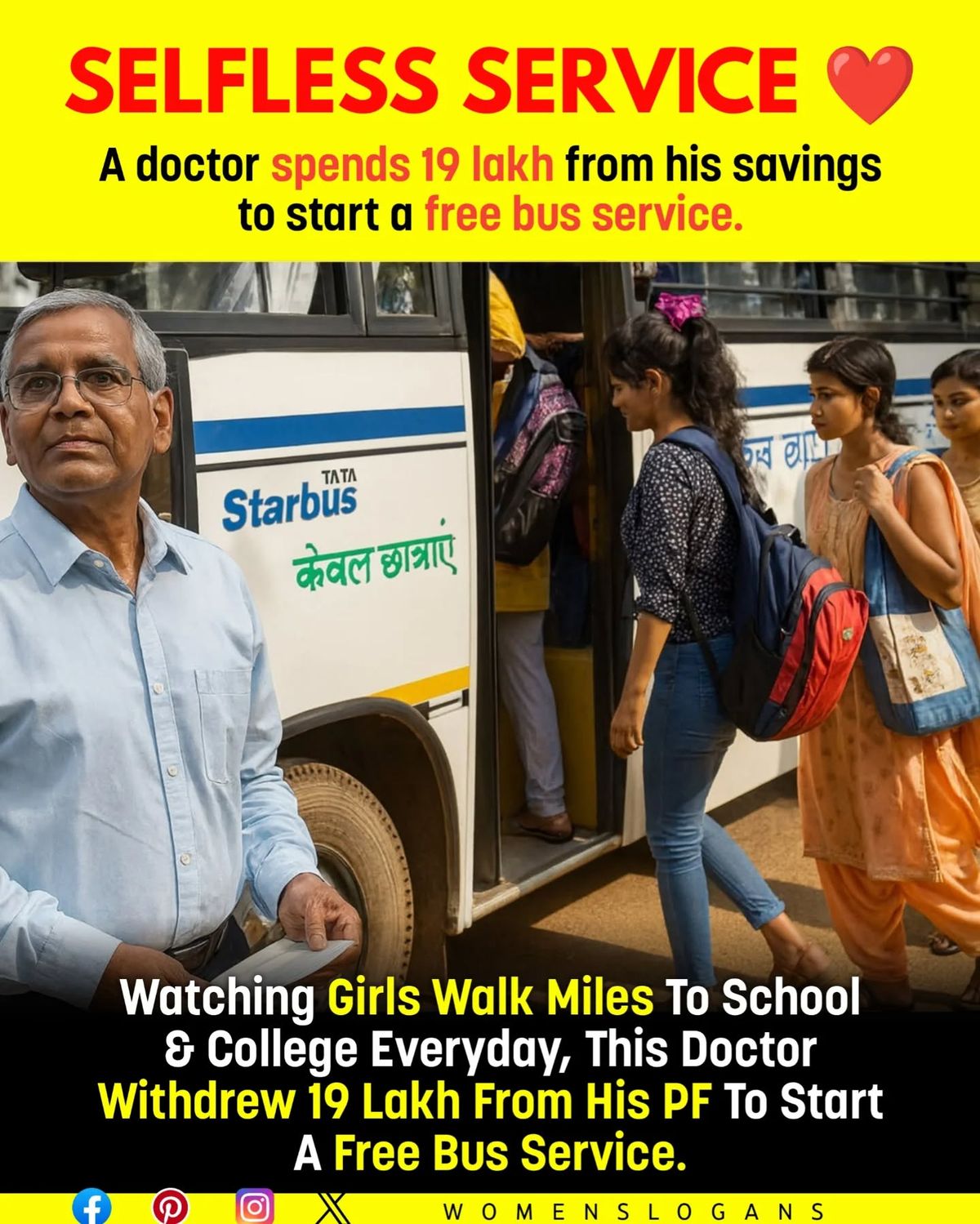 In a world where many chase after wealth and comfort, this humble doctor chose compassion over luxury. After witnessing young girls walk miles every single day to attend school and college, he knew he could not stay silent. Instead of turning away, he took a life-changing step—withdrawing 19 lakh rupees from his provident fund savings to start a free bus service for them. 🌸✨