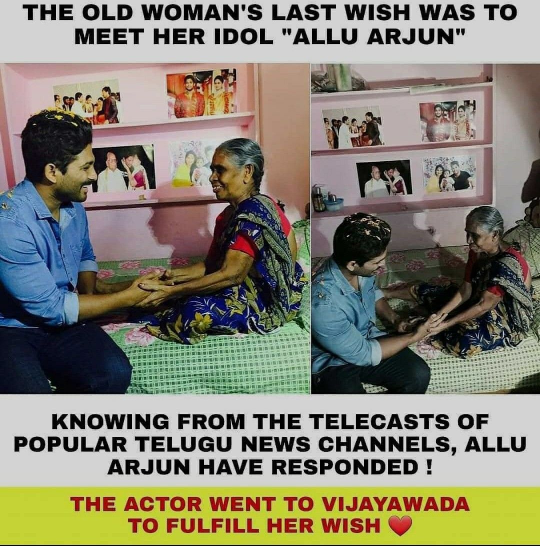 This heart-touching story reminds us that true greatness lies not in fame, wealth, or applause, but in compassion. An elderly woman, nearing the end of her journey, expressed one final wish—to meet her idol, the beloved actor Allu Arjun. 🙏✨