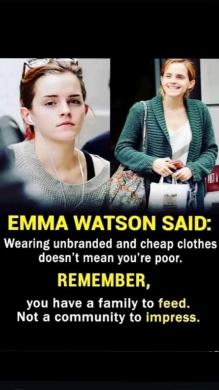 The message in this image is simple, yet deeply impactful. “Wearing unbranded and cheap clothes doesn’t mean you’re poor. Remember, you have a family to feed, not a community to impress.” These words, attributed to Emma Watson, carry wisdom that challenges today’s culture of materialism and societal pressure. 👗💡
