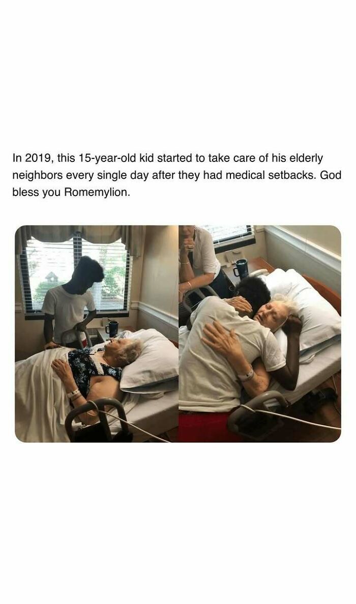 The images above capture the heart of his commitment: gently checking on his elderly neighbor, sitting by her side, and embracing her with the kind of warmth that no medicine can provide. For the woman lying in the hospital bed, his presence became more than just physical helpβit was hope, dignity, and the reassurance that she was not alone. For Romemylion, it was proof that true strength and character are not measured by age, but by the size of oneβs heart. ποΈπ