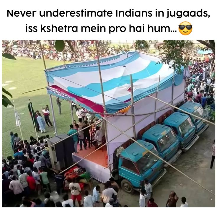 If there’s one thing that sets India apart, it’s the incredible ability of its people to find solutions in the most unexpected ways. The image above is a perfect example of Indian “jugaad”—an ingenious, frugal innovation that transforms everyday challenges into opportunities. Faced with the need for a stable stage setup during a public gathering, instead of spending huge amounts on expensive infrastructure, the organizers came up with a simple yet brilliant idea: they lined up vehicles as the foundation and built a solid platform over them, covered with bamboo, cloth, and colorful tents. The result? A sturdy, elevated stage that could host the event safely and effectively. 🚚✨