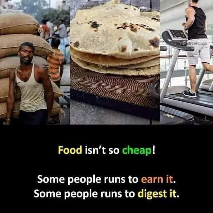 The caption is a poignant truth: โFood isnโt so cheap! Some people run to earn it. Some people run to digest it.โ For the poor, every meal represents hours of labor, sacrifice, and hardship. For the privileged, meals are often taken for granted, with extra effort needed only to manage the abundance. One runs under the hot sun to afford a loaf of bread; the other runs in air-conditioned gyms to shed the weight of too much bread. ๐๐