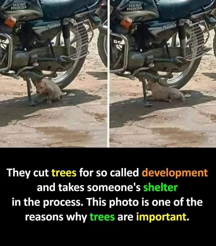 The image above is heartbreaking yet eye-opening—a tiny puppy lying beneath a motorbike, using its shadow for relief from the scorching sun. This simple but powerful scene is a reminder of the silent victims of human-driven “development.” When we cut down trees to make way for roads, buildings, and industries, we are not just removing wood and leaves—we are destroying natural shelters that countless creatures depend on for survival. 🐕🌞