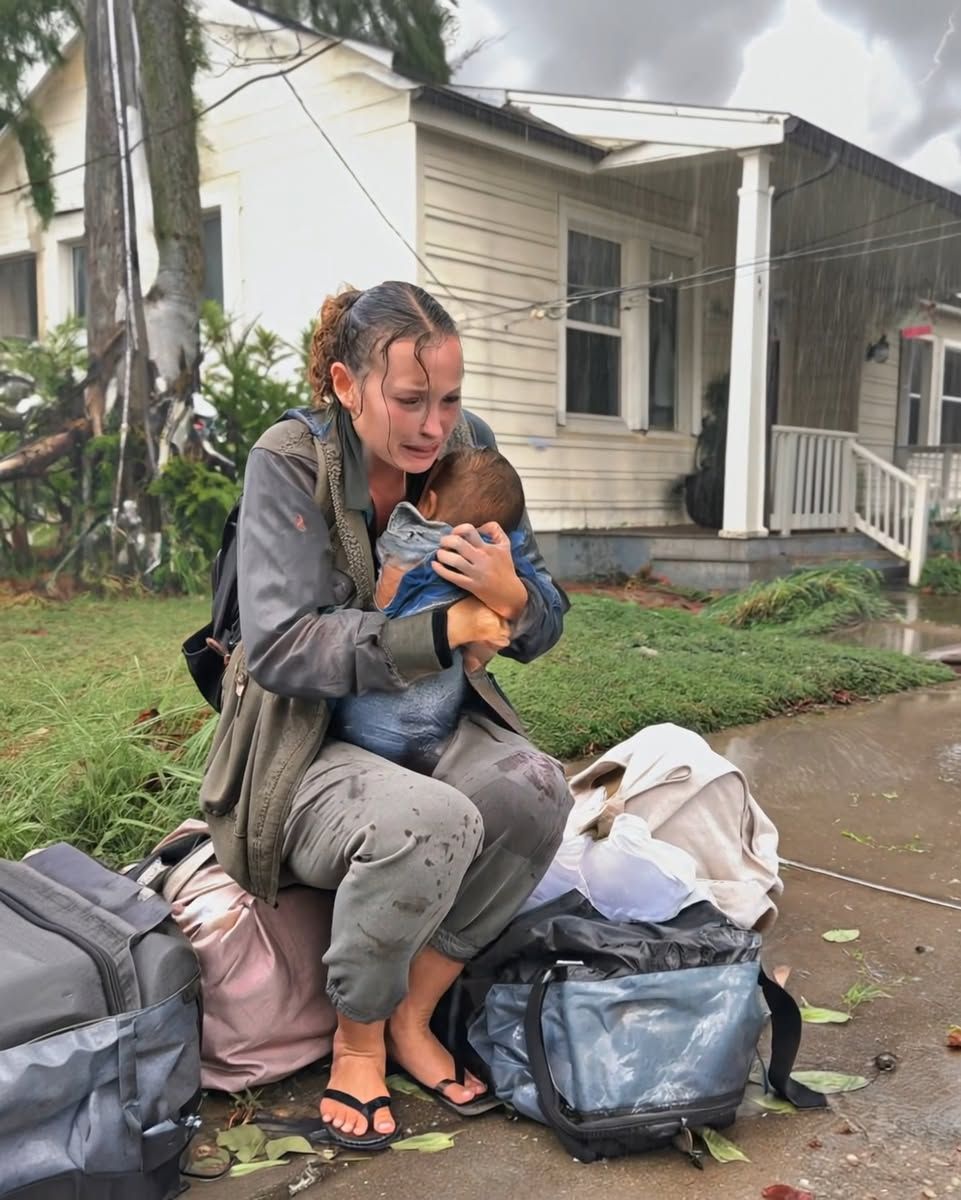 This heartbreaking image captures more than just a moment—it tells a story of love, survival, and resilience in the face of unimaginable hardship. A young mother, drenched in rain, sits on the street clutching her child tightly to her chest. Around her are bags filled with the few belongings she could salvage, while behind her, the storm rages on, its destruction leaving her without shelter. Her face shows exhaustion, fear, and heartbreak—but above all, determination. Because in that moment, nothing else matters except protecting the little life in her arms. 🕊️💔