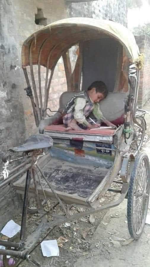 While many children complain about heavy schoolbags, slow Wi-Fi, or the length of homework, this child teaches us a lesson in resilience and determination. He has no proper classroom, no desk, no comfortable chairโbut he has something far more powerful: the will to learn. With every word he writes, he is fighting against poverty, against circumstance, and against the odds stacked against him. His rickshaw may be old and broken, but his dreams are not. ๐๏ธ๐