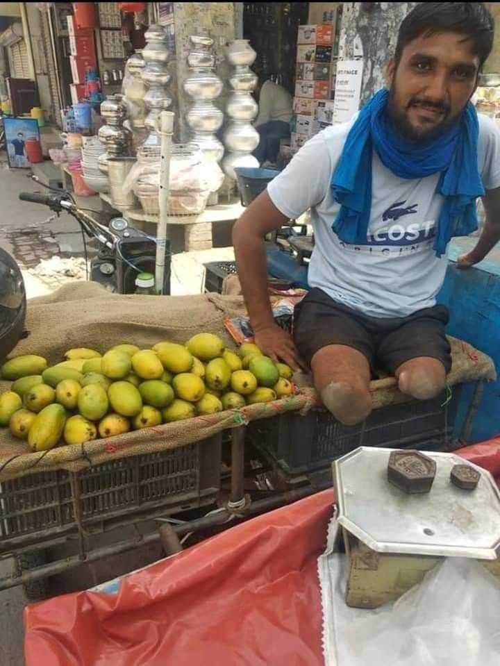 This picture speaks louder than words. A man without legs sits proudly behind his small fruit cart, selling mangoes on the street. Life has tested him in ways many cannot imagine, yet here he is—working with dignity, refusing to beg, and proving that true strength comes not from the body but from the spirit. 🌟🙏