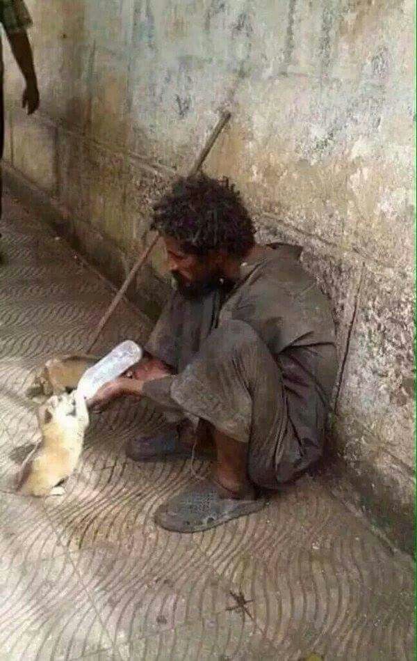 This powerful image shows a homeless man, sitting against a worn-out wall, feeding a stray puppy with a bottle. His clothes may be torn, his body weary, and his life filled with struggles, but his heart shines with a compassion richer than gold. ๐๐โจ