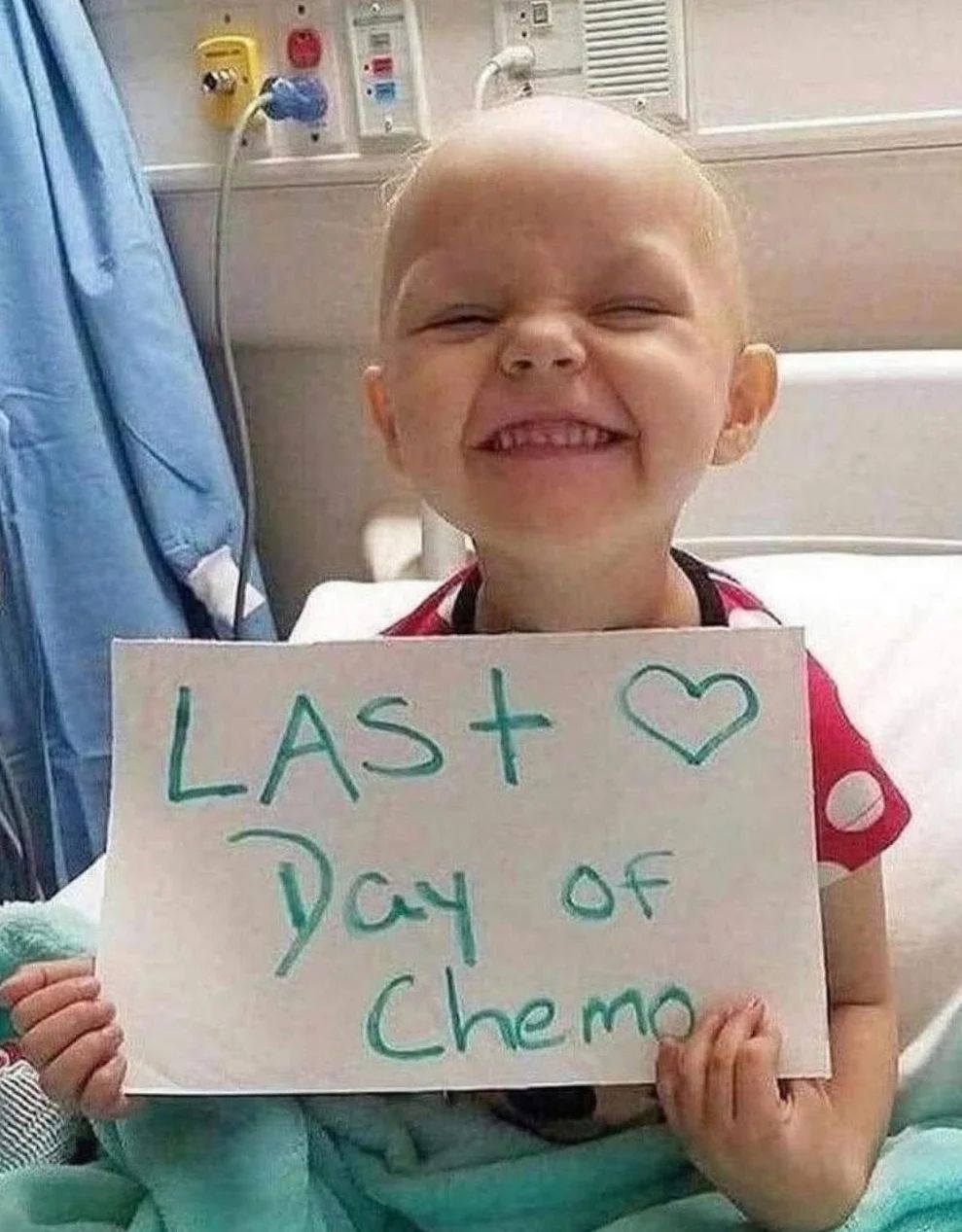 This powerful image captures the purest form of joy—a little warrior, bald from countless chemotherapy sessions, holding up a sign that reads: “Last Day of Chemo ❤️.” Her wide, radiant smile tells a story no words could ever fully capture: a story of courage, endurance, and the triumph of hope over hardship. 🌟