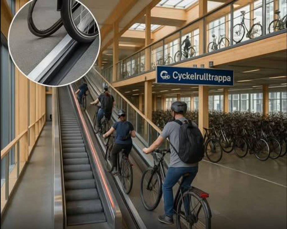 In Sweden, a simple yet brilliant invention is transforming the cycling experience — bike escalators in multi-story parking garages. These mechanical tracks allow cyclists to move their bikes up steep levels effortlessly, eliminating the need to carry them up stairs or push them up ramps. Cyclists simply roll their bikes into a narrow groove, and the system pulls the bike upward as the rider walks beside it. This thoughtful innovation combines modern engineering with practical urban planning, making cities more cyclist-friendly and accessible for everyone.