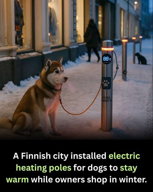 In the icy heart of Finland’s long winter, a beautiful act of kindness has warmed the streets — not for people, but for their four-legged companions. Across cities, electric heating poles have been installed outside shops, cafés, and grocery stores, designed specifically to keep dogs warm while their owners run quick errands. Rather than tying dogs to freezing railings or leaving them to shiver in snowbanks, owners can now clip their pets’ leashes to these cozy poles, offering them gentle warmth and comfort during the coldest months of the year.