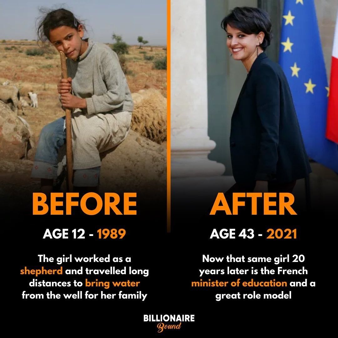 Fast forward to the image on the right, and the transformation is nothing short of inspirational. The same girl, now a confident woman at age 43 in 2021, stands tall as the French Minister of Education. From carrying buckets of water across dry fields to carrying the responsibility of shaping the future of a nation, her journey is a living testament to what perseverance and education can achieve. Her smile reflects not just personal success, but the triumph of every girl who dares to dream beyond her circumstances. ππ