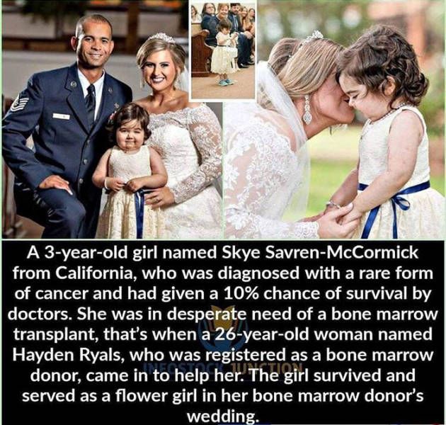 The transplant was a success, and Skye’s story became one of triumph against all odds. What makes this journey even more moving is how it came full circle. Years later, when Hayden got married, she invited Skye—the little girl whose life she had saved—to be her flower girl. Dressed in a white gown, Skye walked down the aisle, symbolizing not only love and joy but the gift of life itself. 🌼👧👰