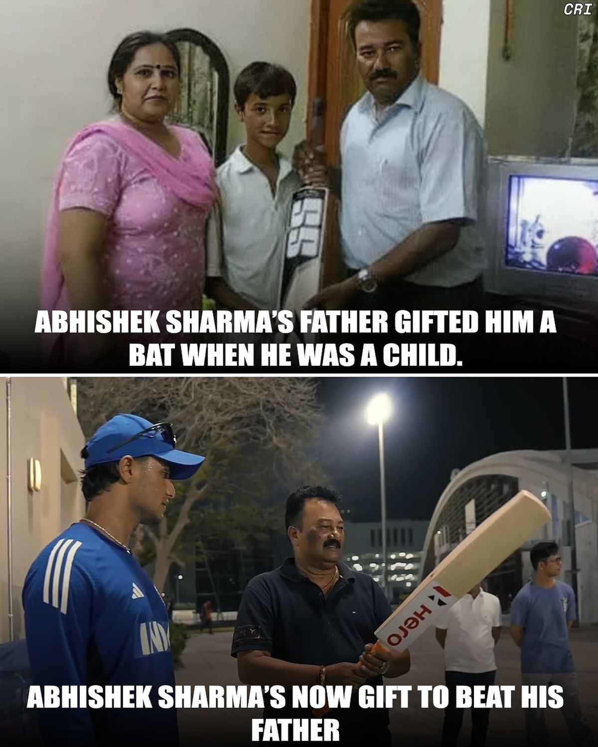 This heartwarming story of Abhishek Sharma and his father captures the true essence of family, sacrifice, and the beautiful cycle of giving back. In the first image, we see a young Abhishek standing proudly with his parents, holding a cricket bat gifted to him by his father. That bat wasnโ€™t just a piece of sports equipmentโ€”it was a symbol of belief, encouragement, and a fatherโ€™s dream for his son. It represented countless hopes that one day, this child might turn passion into purpose. ๐ŸŒŸ๐Ÿ‘จโ€๐Ÿ‘ฆ
