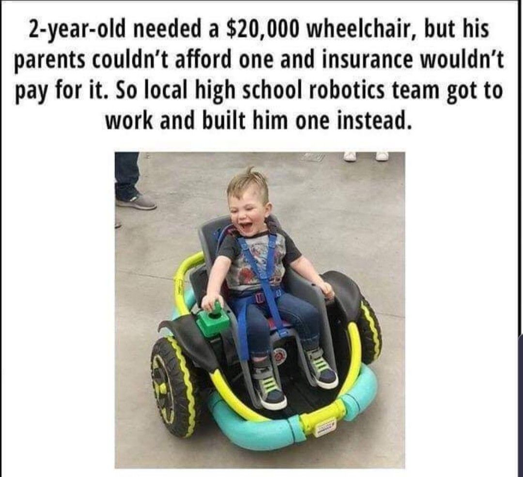 This powerful story shows us the best of humanity—how creativity, kindness, and teamwork can change a life forever. A 2-year-old boy needed a specialized wheelchair that cost nearly $20,000, but his parents couldn’t afford it and insurance refused to cover the expense. For many families, that would have meant heartbreak and struggle. But then, something extraordinary happened—a local high school robotics team decided to step in. Instead of letting cost become a barrier, they used their skills, knowledge, and determination to build a custom wheelchair for him. ⚙️🦾