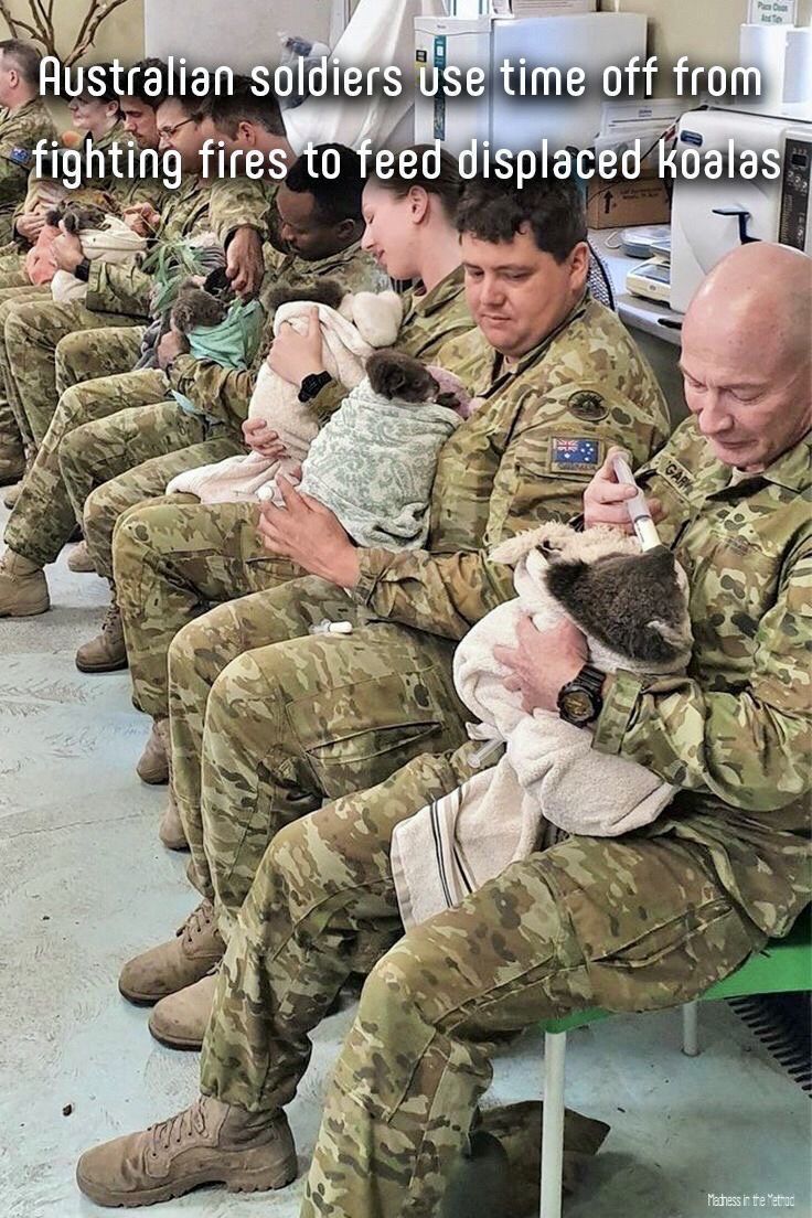 This moving image captures a side of heroism that goes beyond the battlefield. Australian soldiers, exhausted from tirelessly fighting devastating wildfires, chose to spend their rare moments of rest not on themselves, but on the most vulnerable victims of the disasterโdisplaced and injured koalas. Wrapped gently in blankets, the koalas are cradled like infants, being bottle-fed by men and women in uniform whose hands, used to holding weapons, now hold fragile lives with tenderness and care. ๐ฟ๐ฅ๐๏ธ