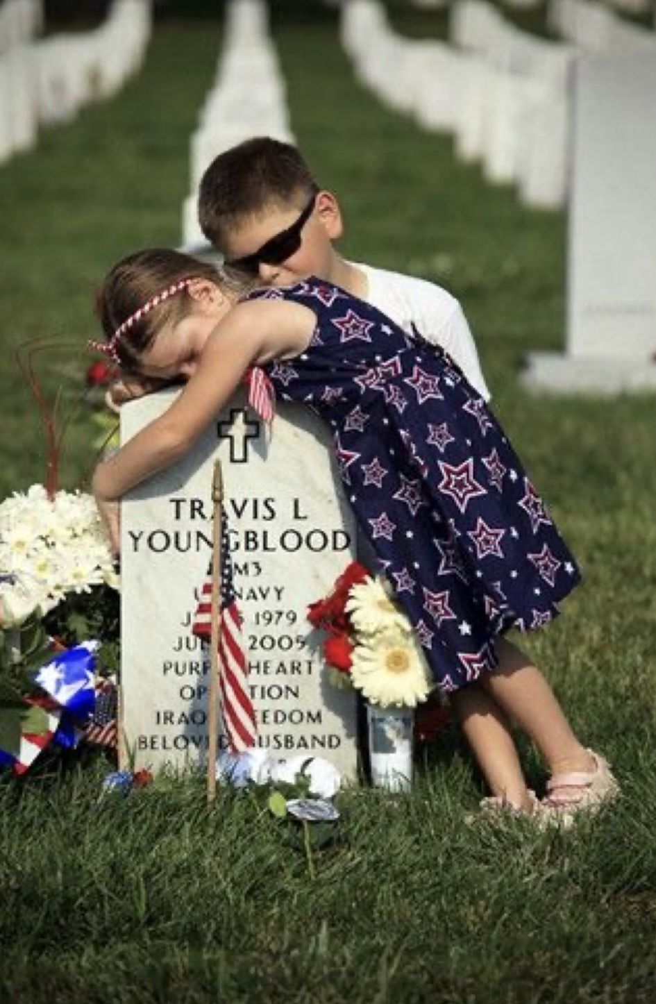 Dressed in a star-spangled dress, the child’s embrace speaks louder than words. It is the embrace of longing, of love unfinished, of memories that will live only through stories and photographs. Her small frame pressed against the cold stone reminds us of the human cost of freedom—families broken, children growing up without fathers, and spouses left carrying the weight of absence. 💔👧