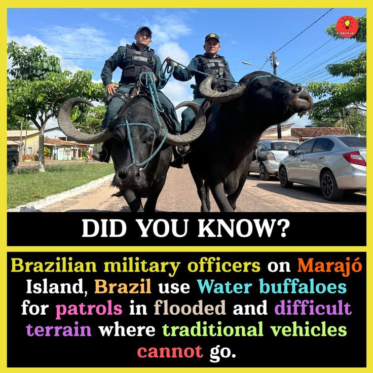 In the heart of Marajó Island, Brazil, where land and water meet in unpredictable harmony, a remarkable image unfolds — two brave Brazilian military officers mounted not on motorcycles or armored trucks, but on majestic water buffaloes. These powerful creatures, symbols of resilience and adaptability, have become essential partners in patrolling flooded villages and treacherous terrains where even the most advanced vehicles dare not go. 🌧️🌿 Their hooves move steadily through the mud and marsh, carrying guardians who protect their communities with quiet courage and determination. This is more than just a unique patrol — it is a testament to human ingenuity and the deep connection between people and nature. 💚