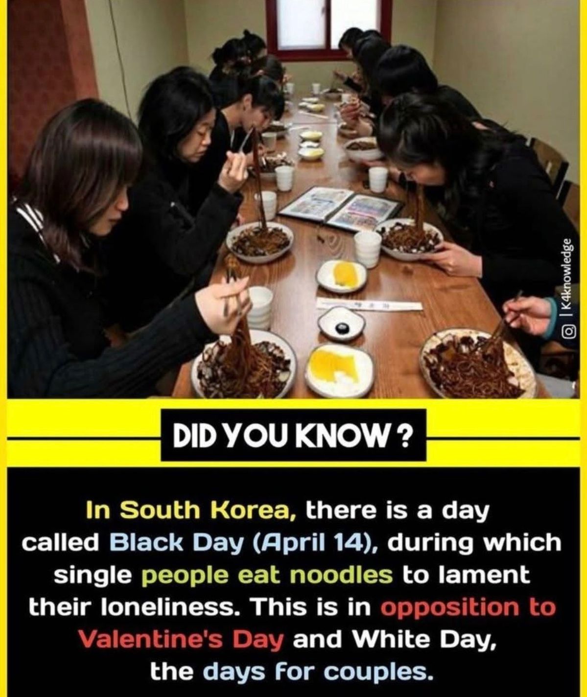 In South Korea, April 14 is not filled with roses, chocolates, or candlelit dinners โ itโs known as Black Day, a day for the single hearts who walk their own path. On this day, cafรฉs and restaurants fill with people dressed in black, quietly sharing bowls of jjajangmyeon, the famous black-bean noodles that symbolize both comfort and solitude. ๐โจ Unlike Valentineโs Day or White Day, which celebrate couples and romance, Black Day honors those who stand alone โ not in bitterness, but in shared understanding. Itโs a day where laughter mixes with a touch of melancholy, where strangers sit together and find connection in their solitude. ๐ค