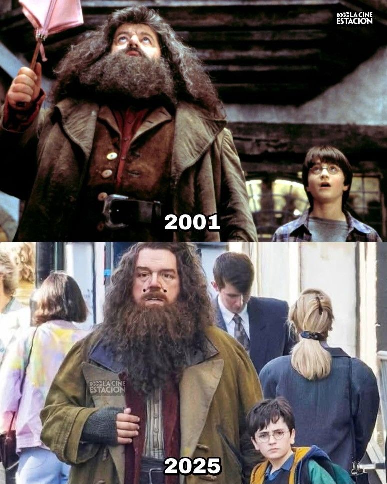 Two images โ one from 2001, the other from 2025 โ and yet they carry the same warmth, the same spark of wonder that first lit up our hearts decades ago. In the top frame, we see that unforgettable moment when a giant with a kind smile introduced a small, wide-eyed boy to a world of magic, friendship, and destiny. ๐งโโ๏ธ๐ The air was filled with mystery, and millions of fans across the globe felt as though they, too, were stepping into Hogwarts for the very first time.