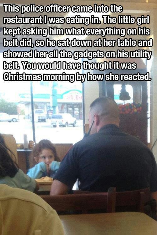 In that small corner of the restaurant, something magical happened: trust was built, fear was replaced with curiosity, and a child’s heart was touched forever. This wasn’t just about a badge or a uniform — it was about humanity, empathy, and the power of connection. The officer didn’t just show her his equipment; he showed her that kindness still wears a badge. 🌈💞