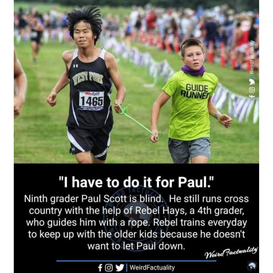 In a world where competition often overshadows compassion, the story of Paul Scott and Rebel Hays shines like a beacon of pure humanity. 🌟 Paul, a ninth grader who is blind, refuses to let his disability define him β€” he runs cross-country races with courage and determination, guided by a fourth grader named Rebel, who holds one end of a simple green rope that connects their strides and their hearts. πŸͺ’πŸ’«