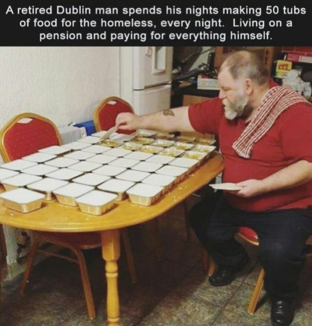 In a quiet kitchen in Dublin, when most people are winding down for the night, one man begins his sacred routine. This retired gentleman—living only on his pension—spends every evening preparing 50 tubs of warm food for the homeless. No sponsors. No charity name. No spotlight. Just love, discipline, and compassion. 🌙