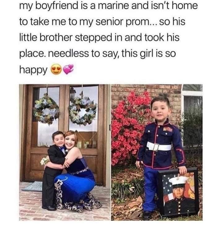 Some moments remind us that love isnโt measured by grand gestures, but by the small acts that carry the biggest hearts. This beautiful photo captures one such moment โ a young girl dressed for her senior prom, her smile shining brighter than any spotlight. Her boyfriend, a Marine, couldnโt be there to take her because he was serving his country. But love found another way to show up that night โ through his little brother, who proudly stepped in wearing a miniature Marine uniform to take her to prom in his place. ๐