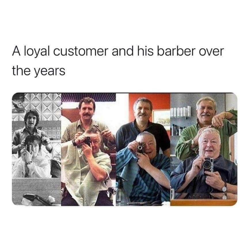 Some bonds are not written in grand gestures, but in the quiet, consistent rhythm of life โ like the simple ritual of a haircut. This touching photo collage tells the story of a loyal customer and his barber, captured through the decades in the same pose, in the same mirror, with the same warmth in their smiles. From black-and-white beginnings to the soft tones of modern times, you can almost feel the years passing โ hairlines changing, faces aging, but friendship staying beautifully constant. ๐โค๏ธ