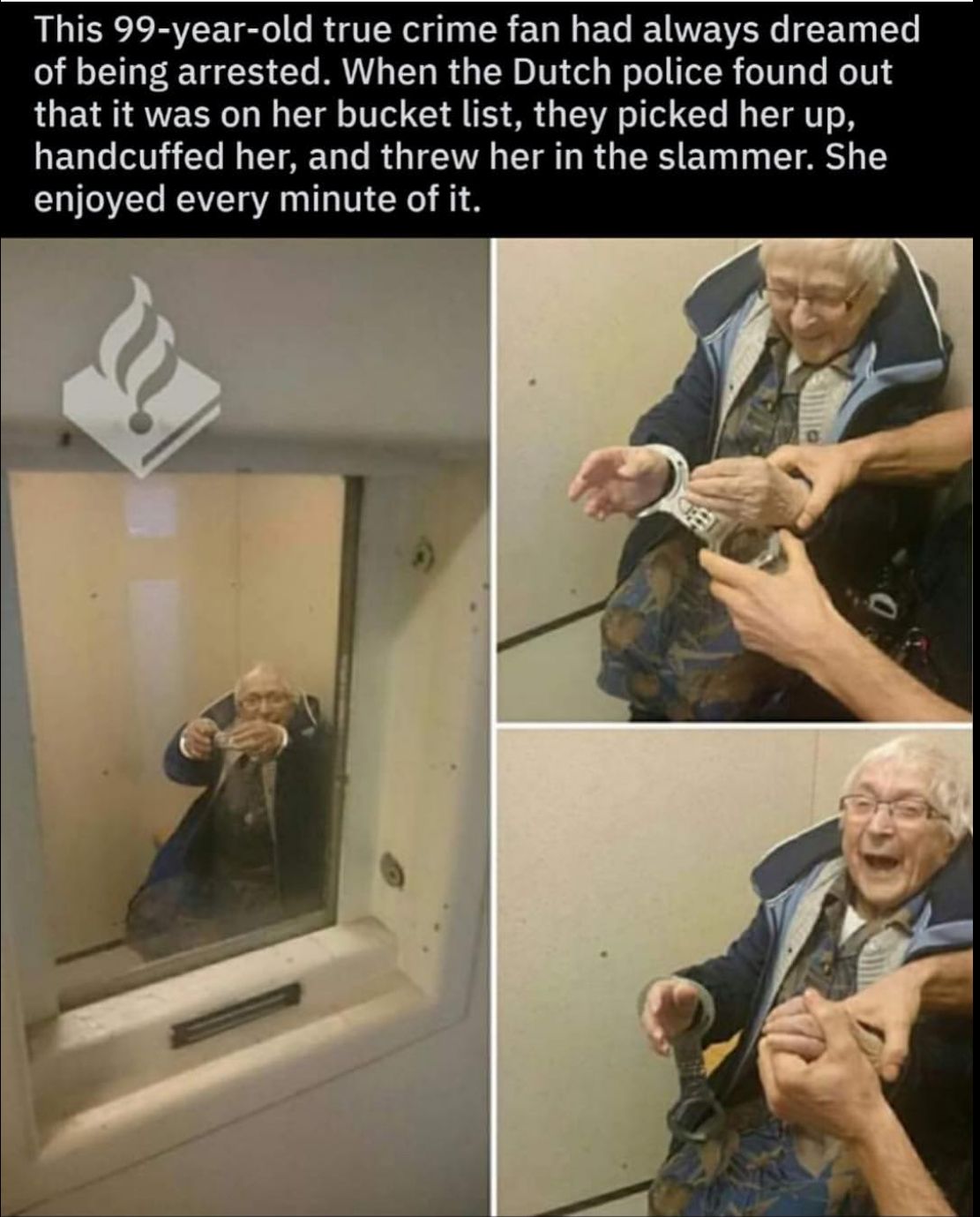 Age might slow the body, but it can never tame the spirit — and this delightful 99-year-old Dutch woman proved it in the most unforgettable way. A lifelong fan of true crime stories, she had one unusual wish on her bucket list: to know what it felt like to be arrested. When the local police heard about her dream, they decided to make it come true — in the most heartwarming (and hilarious) way possible. 👮♀️✨