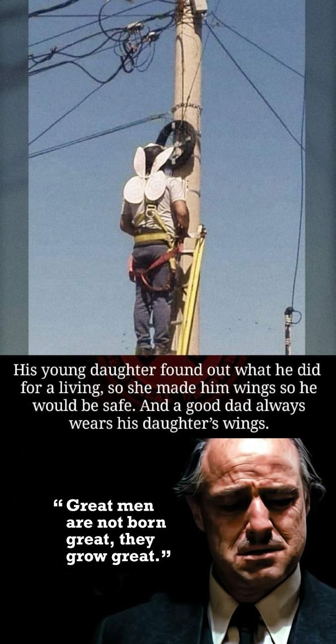 In a world where superheroes often wear capes, this photo reminds us that the truest heroes wear love — even in the form of paper wings. High above the ground, a hardworking father climbs an electric pole, risking his safety to provide for his family. But look closer — on his back, attached carefully to his harness, are tiny white wings made by his young daughter. When she found out what her father did for a living, she worried for him. So, with a child’s pure heart, she crafted wings so he could be “safe while flying.” And a good dad, of course, wore them with pride. 💖