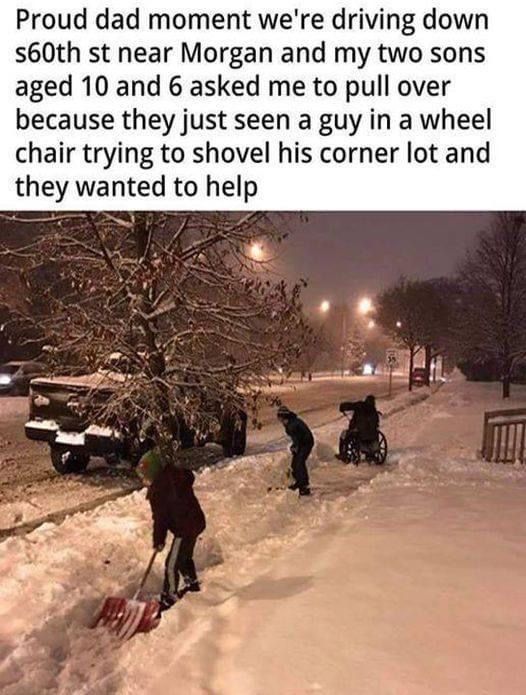 Under the glow of streetlights and a blanket of falling snow, this photo captures something truly heartwarming โ the kind of moment that restores faith in humanity. A father was driving with his two young sons, aged 10 and 6, when they spotted a man in a wheelchair struggling to shovel snow outside his corner lot. Without hesitation, the boys asked their dad to pull over โ not to play, not to rest, but to help. โค๏ธ