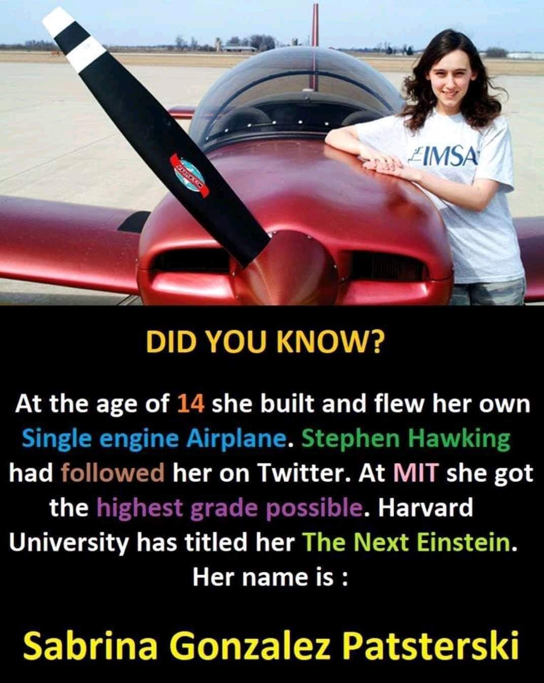 At just 14 years old, while most teenagers were worrying about school projects, Sabrina Gonzalez Pasterski was busy building and flying her own single-engine airplane. 🛩️💫 Her extraordinary brilliance quickly caught the attention of some of the world’s greatest minds — even the legendary Stephen Hawking followed her work on Twitter, impressed by her intellect and potential.