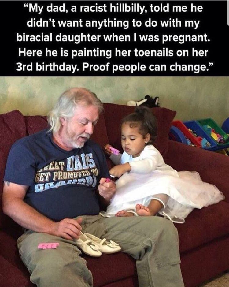 This powerful image captures a transformation far deeper than words can express — the moment a grandfather paints his granddaughter’s toenails on her 3rd birthday. What makes it extraordinary is the story behind it. Years earlier, when his daughter became pregnant, he had rejected her and wanted nothing to do with her biracial child. He was set in his ways, hardened by prejudice and ignorance. But love — pure, innocent, unfiltered love — found its way into his heart through the tiny hands of a little girl in a white dress. 🌈✨