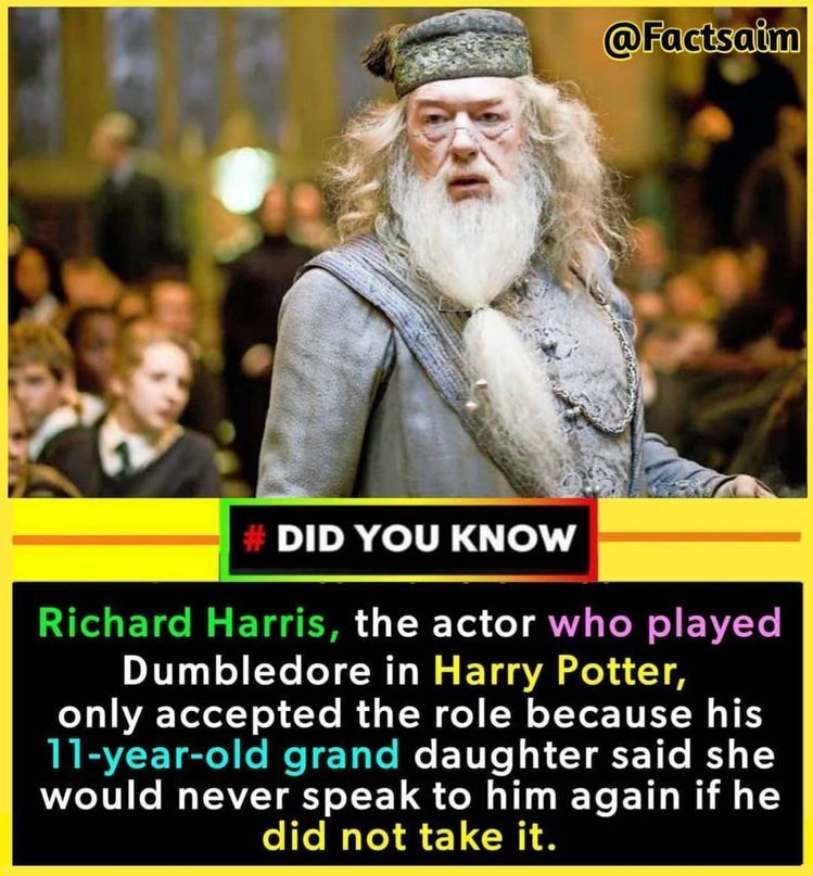 Sometimes, the most magical roles in life come from love β not fame. Richard Harris, the legendary actor who first brought Professor Albus Dumbledore to life in Harry Potter and the Sorcererβs Stone, originally didnβt want to take the role. But destiny had other plans β in the form of his 11-year-old granddaughter. β€οΈ