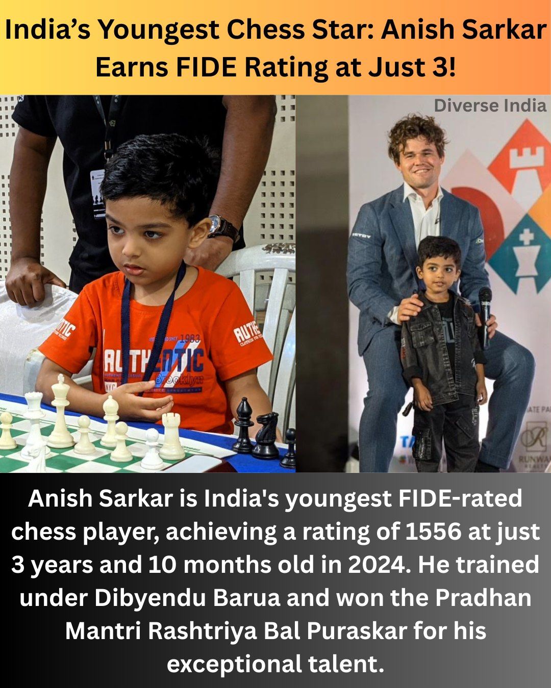 At just three years old, when most children are learning their ABCs or playing with toys, little Anish Sarkar is already conquering chessboards with the calm focus of a prodigy. Born with an extraordinary gift, Anish has become Indiaβs youngest FIDE-rated chess player, earning a remarkable rating of 1556 before even turning four. π His journey began not with fanfare, but with curiosity β a tiny hand reaching for a pawn, a gleam of wonder in his eyes, and a world of strategy unfolding one move at a time.