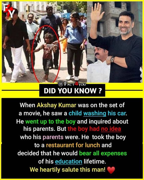 In a world where fame often overshadows humanity, this photograph tells a story that restores faith in kindness. While shooting a film, Bollywood superstar Akshay Kumar noticed a young boy washing his car under the blazing sun. Curious and moved, he approached the child gently and asked about his family. To his shock, the boy didn’t even know who his parents were — an orphan lost in the chaos of the city, surviving by cleaning cars. Instead of walking away, Akshay Kumar did something extraordinary. He took the boy out for a warm meal at a restaurant, listened to his story, and made a life-changing decision: he would bear the child’s educational expenses for his entire lifetime. 🌿✨ That one moment of compassion turned despair into hope, transforming a forgotten street child’s future forever. Stories like these remind us that true heroes don’t just act on screen—they live their values in the real world, quietly changing lives with empathy and love. Every act of kindness, no matter how small, ripples into generations. 💫❤️ Let this image be a timeless reminder that genuine greatness shines brightest in acts of humility and care for those who have nothing to give back but gratitude. 🙏