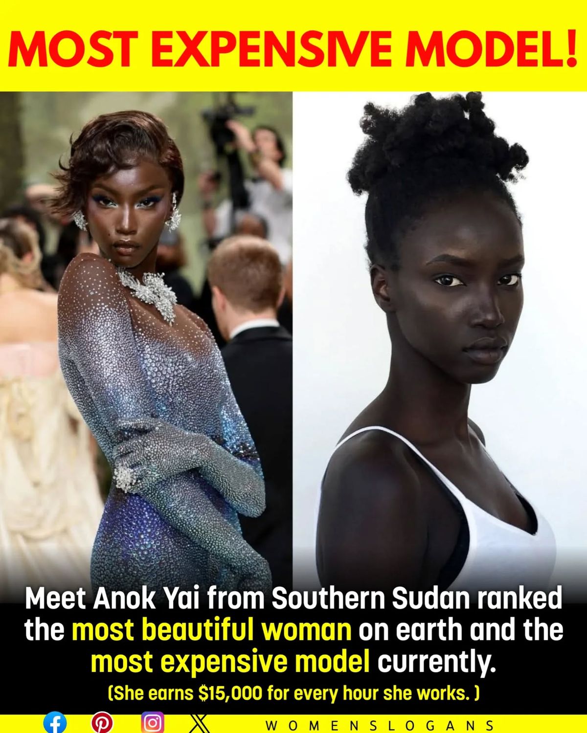 In an industry once defined by narrow standards, Anok Yai emerged like a force of nature — bold, radiant, and unapologetically herself. 🌹 Born in Southern Sudan and raised in the United States, Anok’s journey from a viral photo at a college event to becoming one of the world’s most expensive and admired models is nothing short of extraordinary. She now earns an astonishing $15,000 per hour, a testament to not just her elegance but her influence in reshaping global perceptions of beauty. 💫 Her deep skin tone glows like onyx under the lights, her posture commands attention, and her presence tells a story of resilience — a story of a woman who turned representation into revolution. 💃🏿🔥 Anok stands as a symbol for millions of young girls around the world — proving that true beauty lies in confidence, identity, and the courage to stand tall in your own skin. She has graced the runways of Chanel, Prada, and Versace, not just as a model, but as a living statement that black is beautiful, powerful, and priceless. 🌺💎 Her success is more than glamour — it’s history in motion, redefining what the world calls beautiful.