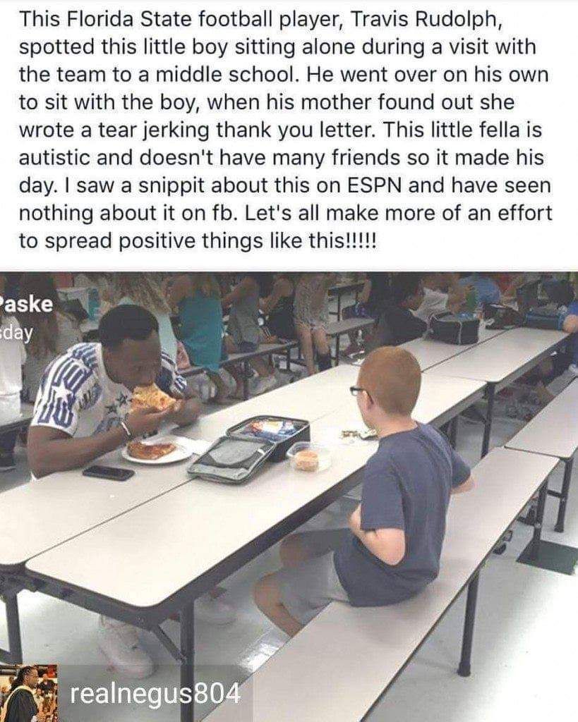 In this touching moment caught on camera, Florida State football player Travis Rudolph unknowingly created a memory that would touch hearts across the world. During a school visit, Travis noticed a young boy sitting completely alone in the cafeteria โ€” quietly eating by himself while surrounded by chatter and laughter. Without hesitation, Travis picked up his lunch tray and sat down beside him. ๐Ÿ’ซ What he didnโ€™t know was that the boy, Bo Paske, is autistic and often eats alone because he struggles to make friends. That one small act of kindness โ€” sharing pizza and conversation โ€” became a turning point not only for Boโ€™s day but for his confidence. โค๏ธ When Boโ€™s mother learned what happened, she wrote a tearful thank-you letter that went viral, describing how her son came home smiling wider than ever before. It wasnโ€™t a grand gesture or a headline moment โ€” just a simple, genuine act of human decency that reminded the world what compassion looks like. ๐ŸŒโœจ Travis Rudolph didnโ€™t just share a meal; he shared hope, reminding us all that kindness costs nothing but can mean everything to someone who feels invisible. ๐Ÿ•Š๏ธ๐Ÿ’–