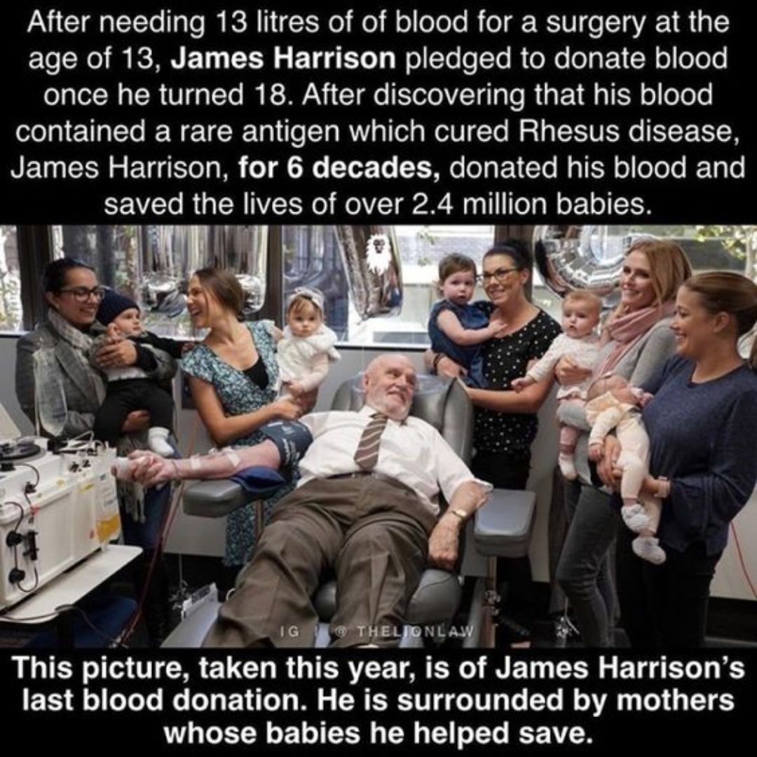 This unforgettable photograph captures the final blood donation of James Harrison, a man whose quiet generosity saved over 2.4 million babies. 🌍👶 At age 13, James nearly lost his life during a major surgery, surviving only because of 13 liters of donated blood. Grateful for that second chance, he made a promise — that when he turned 18, he would dedicate his life to giving back. What no one expected was that his blood carried a rare antibody capable of curing Rhesus disease, a deadly condition that causes unborn babies to suffer from severe anemia. For over six decades, he donated blood almost every week, transforming his veins into a lifeline for millions of mothers and children. 🙏💫